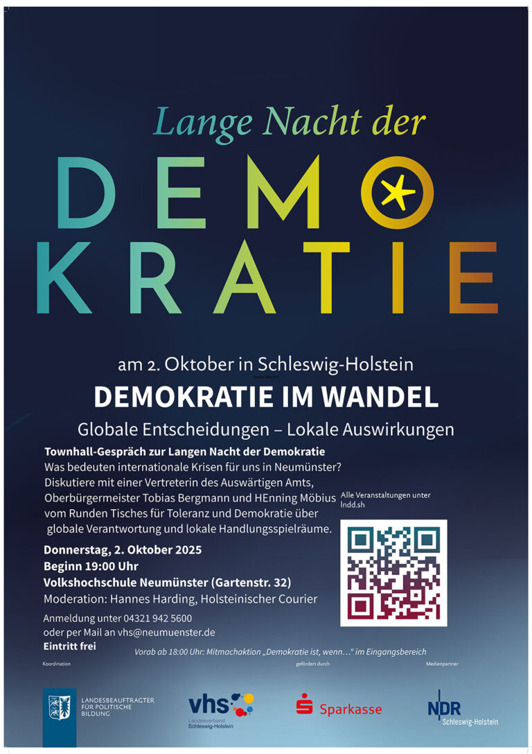 am Donnerstag, 2. Oktober 2025, beteiligt sich Neumünster an der landesweiten „Langen Nacht der Demokratie