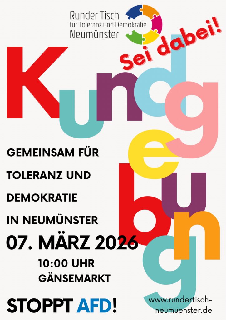 Am 4. November will die AfD in Neumünster mit Polemik gegen Migrant*innen und Asylbewerber*innen einen weiteren Spalt in unsere Zivilgesellschaft treiben. Dabei steht diese Partei für eine rassistische Politik der Menschenverachtung und der Ausgrenzung. Wir lassen es nicht zu, dass solche Positionen in Neumünster unwidersprochen bleiben und dass die AfD ungestört ihre Hetze verbreiten kann. […]